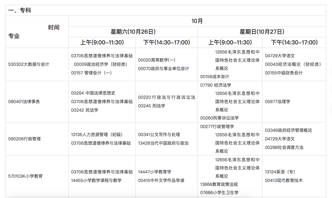 一、开考专业、开考课程及时间安排