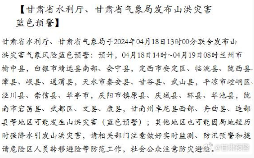 甘肃省水利厅、甘肃省气象局于2024年04月18日13时00分联合发布山洪灾害气象风险蓝色预警:预计,04月18日14时~04月19日08时兰州市榆中县,白银市靖远县南部、会宁县,定西市安定区、临洮县、陇西县、漳县、岷县、通渭县,天水市秦安县、甘谷县、武山县,平凉市崆峒区、泾川县、崇信县、华亭市,庆阳市镇原县、庆城县、环县、华池县,陇南市宕昌县、武都区、文县、康县,甘南州卓尼县西部、舟曲县、迭部县等地区可能发生山洪灾害(蓝色预警) ;其他地区也可能因局地短历时强降水引发山洪灾害,请相关部门注意做好实时监测、防汛预警和提请危险区人员转移避险等防范工作,社会公众注意防灾避险。