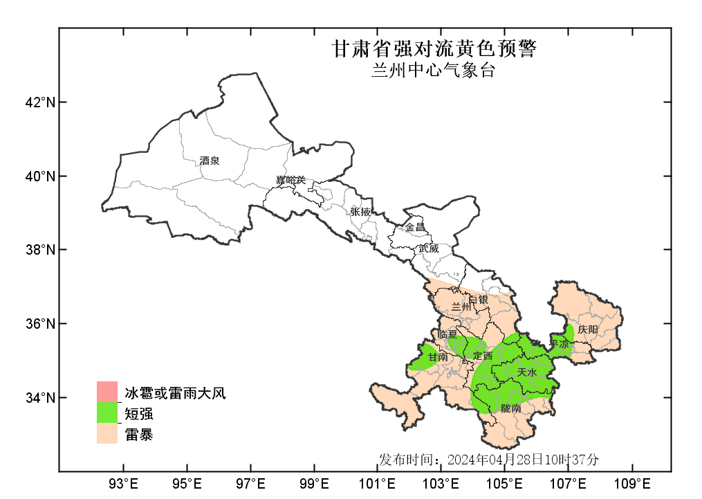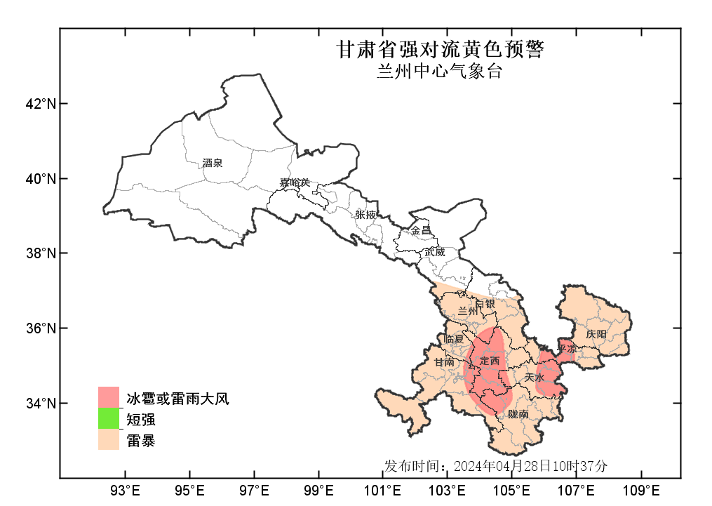 兰州中心气象台2024年04月28日10时37分发布强对流黄色预警:预计今天下午到夜间,武威以东大部分地方有雷暴;其中,定西、天水、平凉三市及陇南北部、临夏东部、甘南北部和东部局部地方有分散性短时强降水,最大小时雨强为20-35毫米;定西、平凉两市及临夏东部、甘南东部、天水东部、陇南北部局部地方有分散性雷雨大风或冰雹。请注意防范。