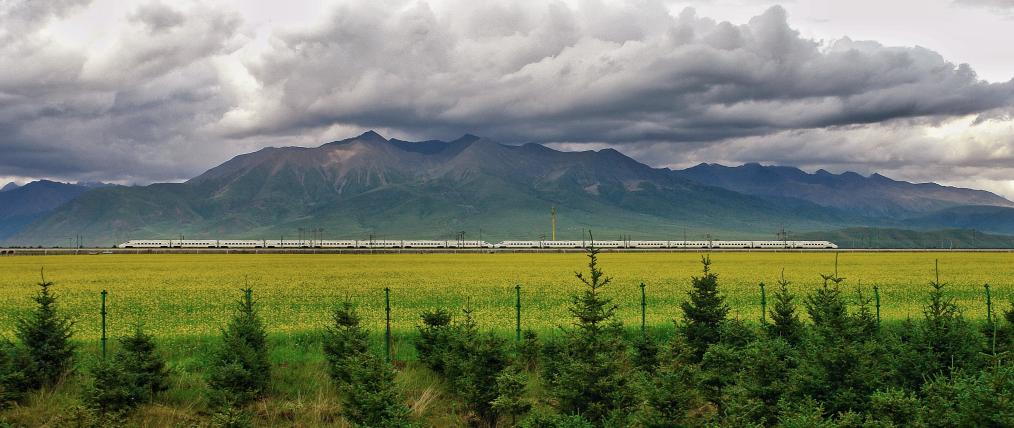 白色动车在门源的草原上疾驰,远处的油菜花田里满是泛黄的花苞。