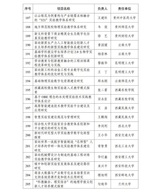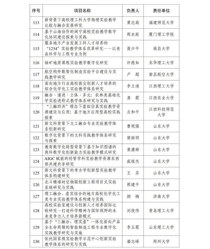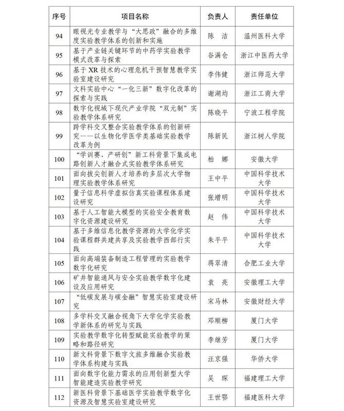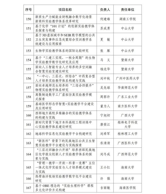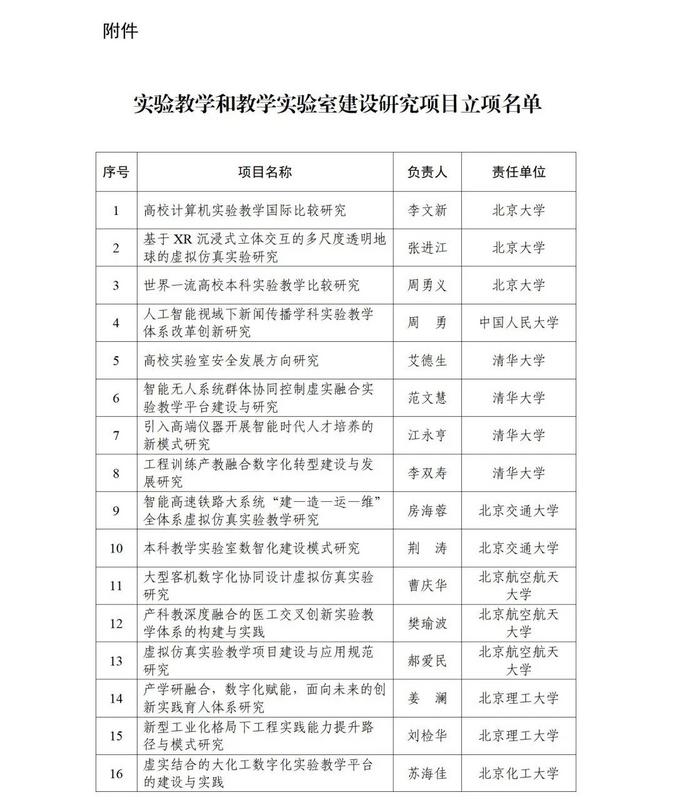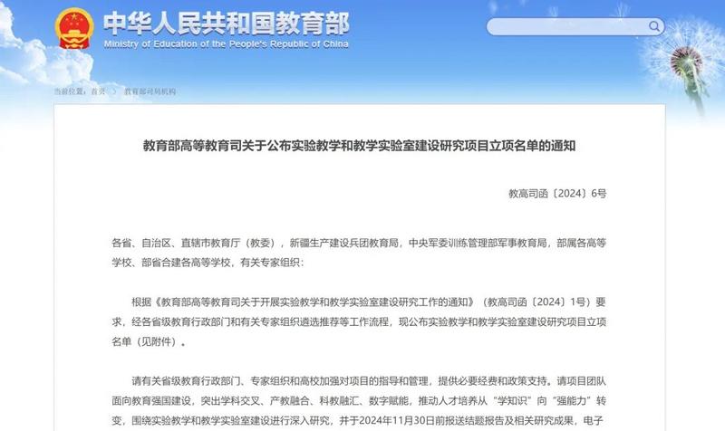 根据《教育部高等教育司关于开展实验教学和教学实验室建设研究工作的通知》(教高司函〔2024〕1号)要求,经各省级教育行政部门和有关专家组织遴选推荐等工作流程,现公布实验教学和教学实验室建设研究项目立项名单(见附件)。