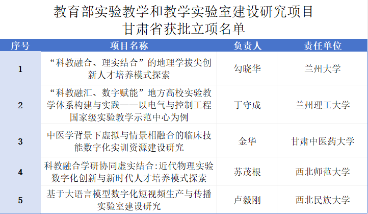 近日,教育部高等教育司印发了《关于公布实验教学和教学实验室建设研究项目立项名单的通知》,我省兰州大学等5所高校5个项目成功获批。一起来看↓↓↓