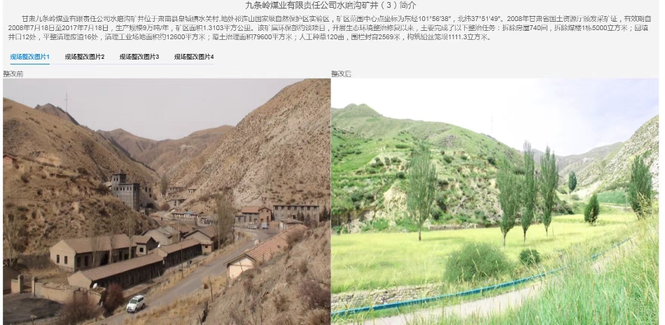 “九条岭煤矿处在祁连山保护区的实验区,对比整改前后的两张卫星遥感影像,我们可以看到原来的建筑物、堆煤场都已经彻底地清除,通过采取覆土绿化等措施,目前这片区域生态恢复得非常好。”张飞指着大屏幕上的卫星图说。