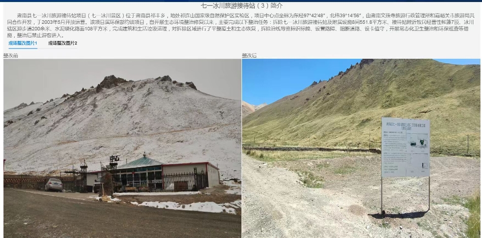 “七一冰川接待站以前是一个旅游项目,对比整改前后的卫星遥感影像,周围的附属设施以及牧民的帐篷都已经全部拆除,通过采取覆土平整绿化等措施,目前这片区域生态也是恢复得非常好。”张飞介绍道。