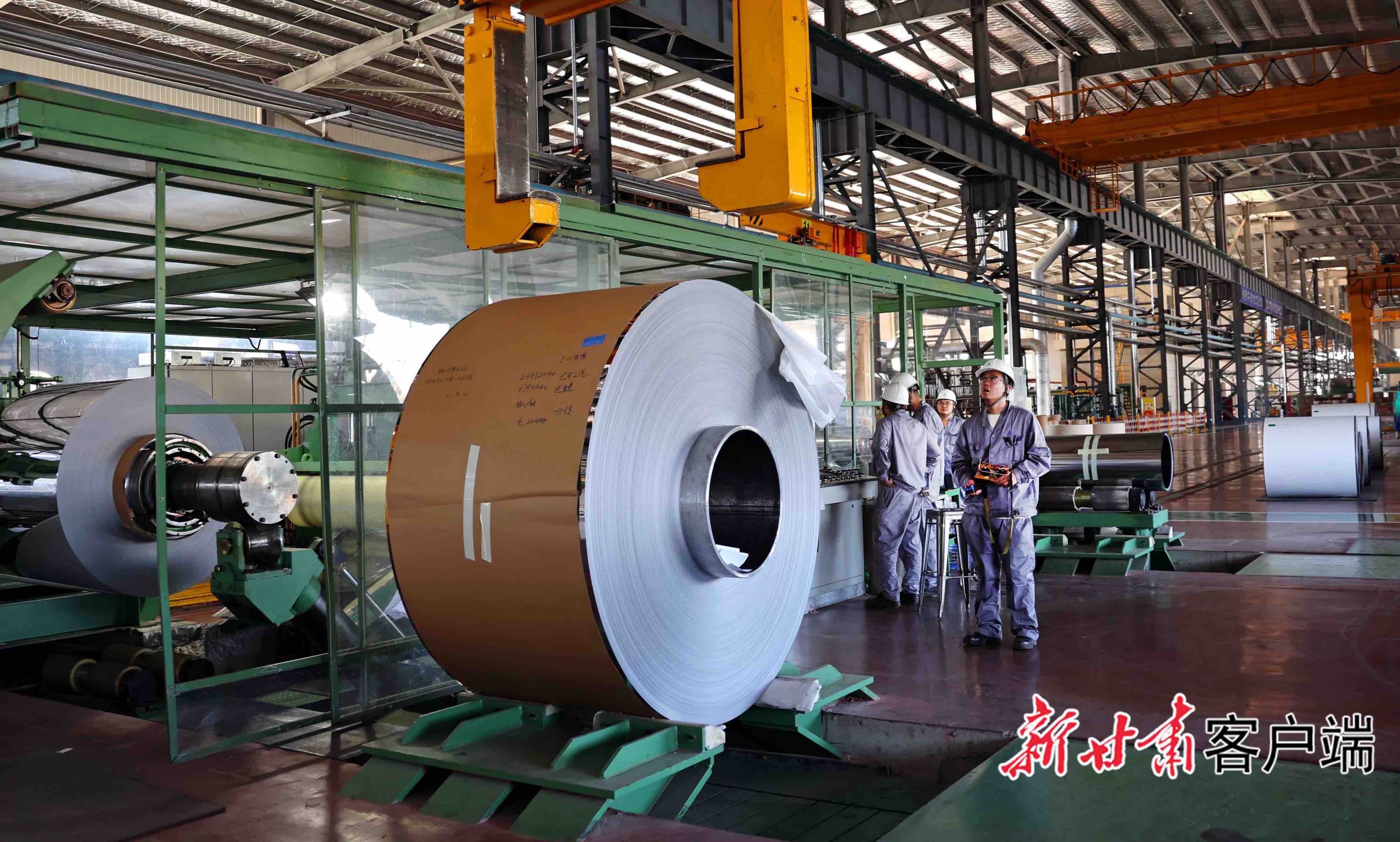 甘肃甬金金属科技公司工人正在生产线上调运轧成的不锈钢板带产品。 新甘肃·甘肃日报记者 田蹊