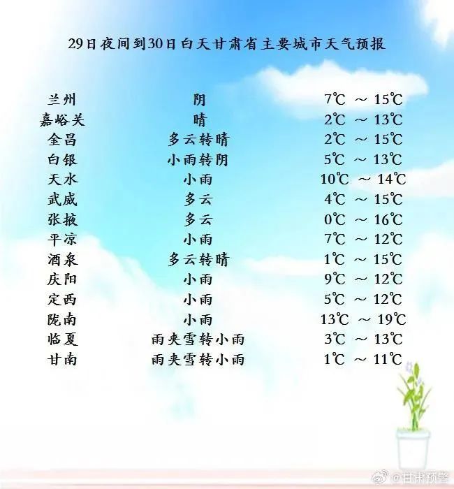 明天夜间到后天白天(10月30日20时-10月31日20时),甘南、临夏、定西、陇南、天水、平凉、庆阳等州市阴有小雨(雪)或雨夹雪,其中陇南、天水、平凉三市部分地方及定西市南部、庆阳市南部有中雨,甘岷山区、太子山沿线等高海拔地区有中雪;酒泉、嘉峪关、张掖三市多云,祁连山区阴有小雪;省内其余地方多云或阴,部分地方有小雨(雪)或雨夹雪。