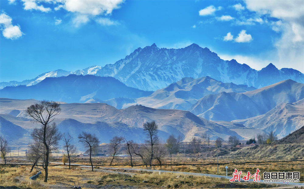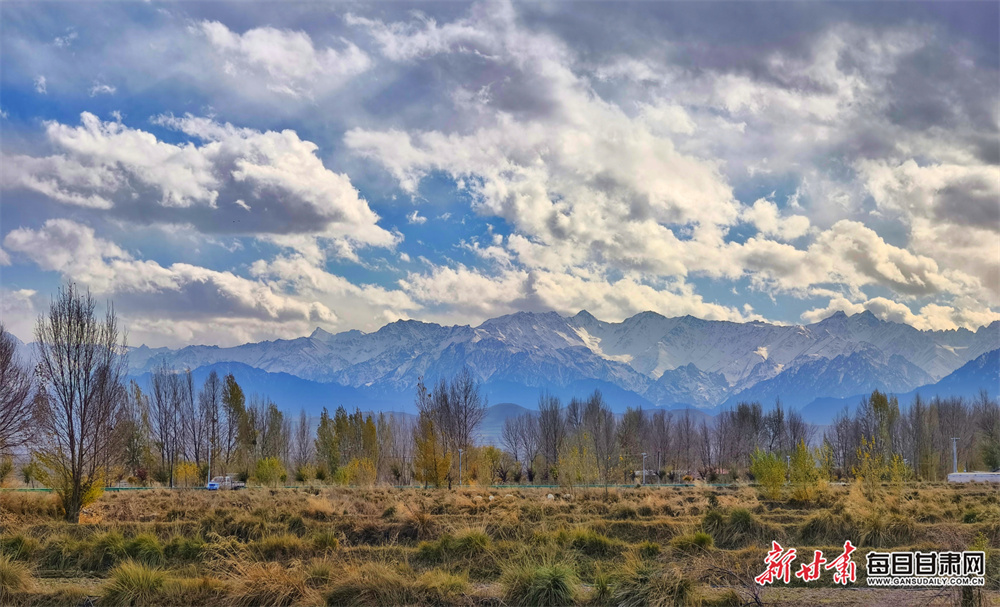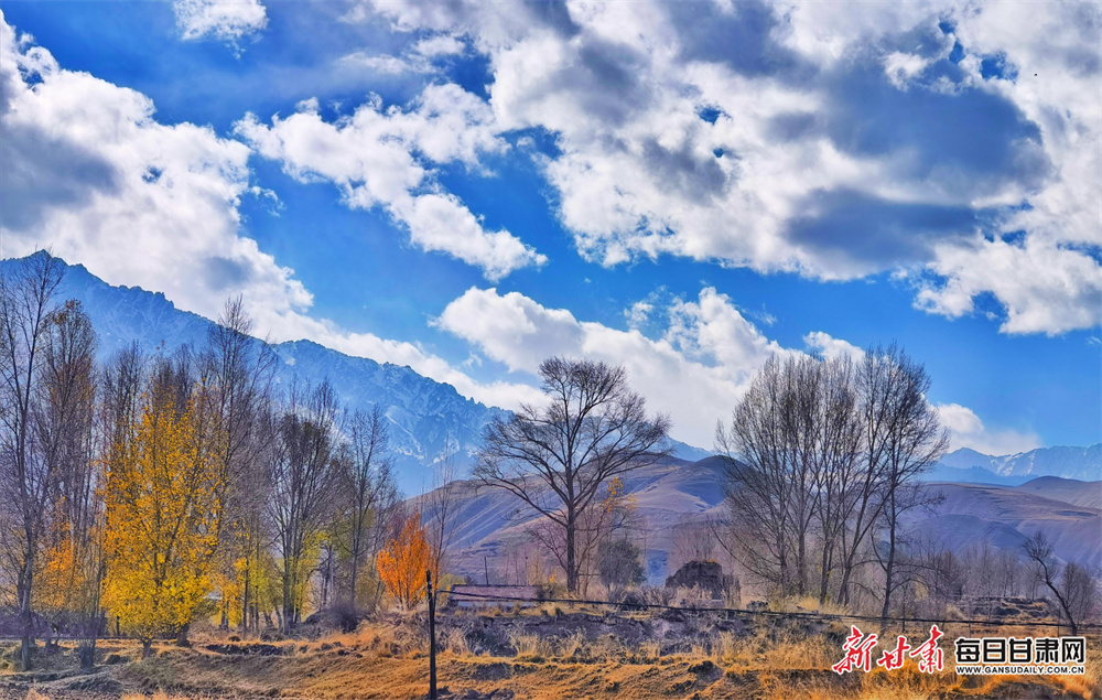 11月1日,祁连山脚下的民乐县层林尽染,秋意浓浓,雪山、村庄、田园、植被在秋色的“浓墨重彩”下,构成了一幅美丽的生态画卷。
