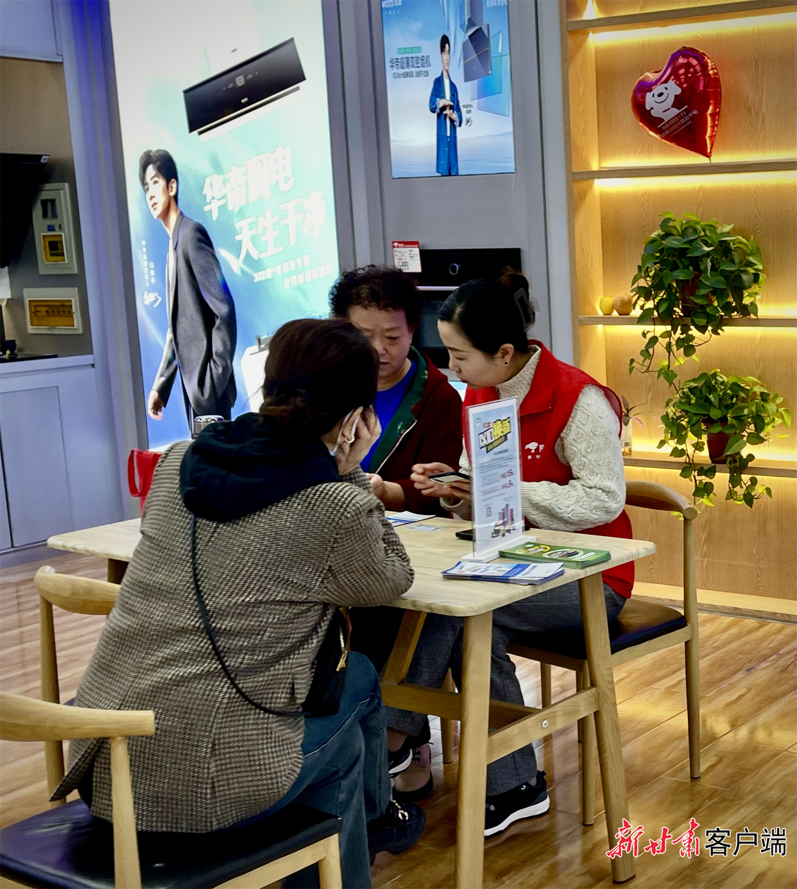 在商场的某厨房家电门店,销售员王海霞正在帮助兰州市民赵燕梅在“甘快办”客户端上办理以旧换新补贴申请。
