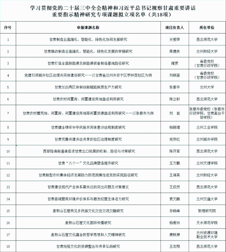 学习贯彻党的二十届三中全会精神和习近平总书记视察甘肃重要讲话重要指示精神研究专项课题拟立项名单(共18项)