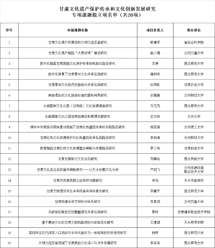 甘肃文化遗产保护传承和文化创新发展研究专项课题拟立项名单(共20项)