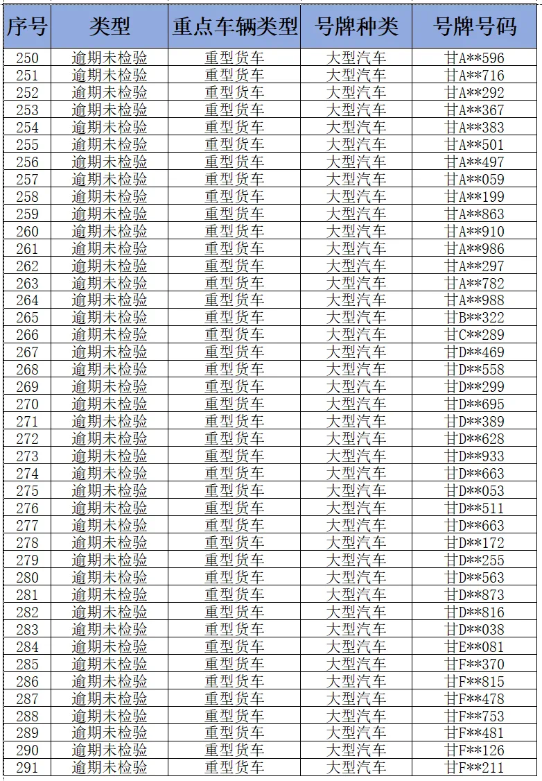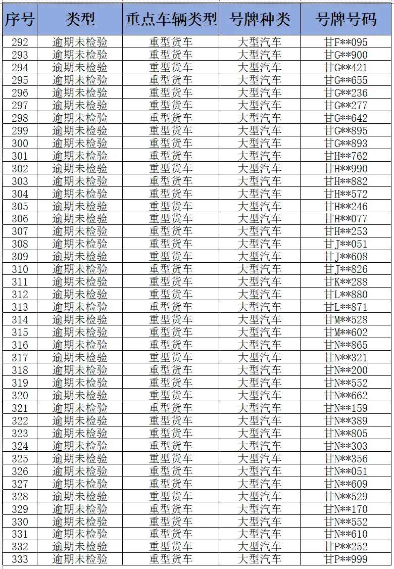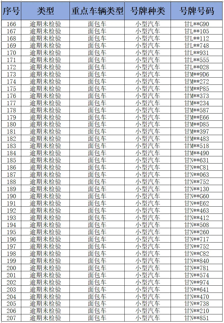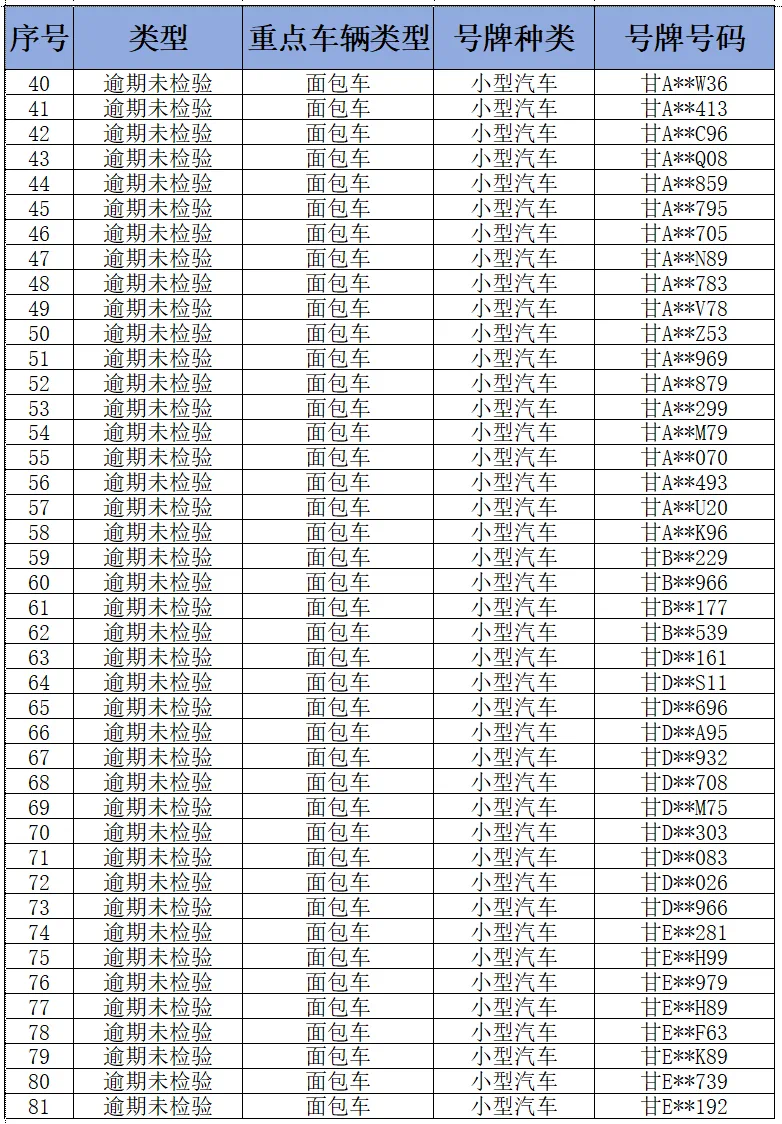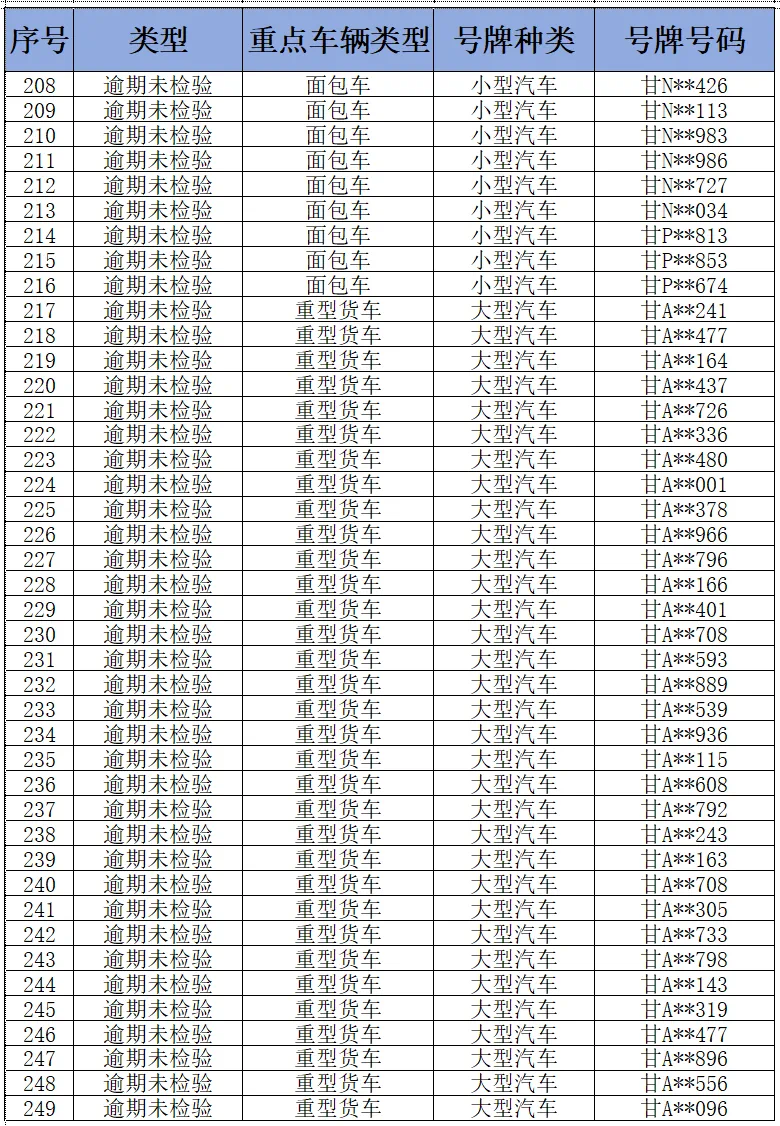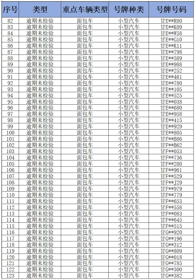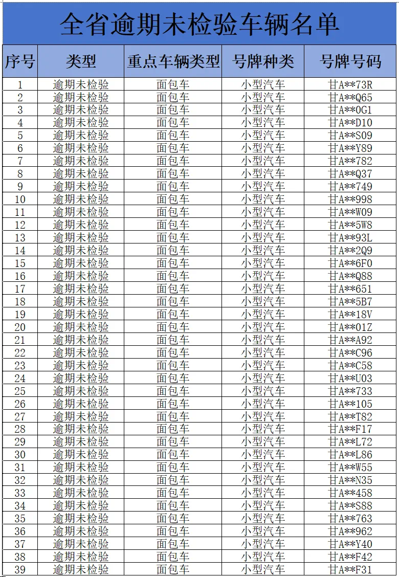 为进一步消除道路交通安全管理源头隐患,纵深推进道路交通事故隐患排查整治,全面落实重点车辆逾期未检验和逾期未报废“清零”工作,预防和减少道路交通事故,甘肃省公安厅交通管理局现对全省逾期未检验面包车和重型货车予以曝光(截至2024年11月3日),请车辆所属企业相关负责人、管理人、驾驶员尽快年检车辆。