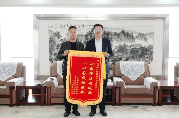 2024年11月20日上午,交通银行甘肃省分行收到来自陇南市徽县榆树乡的印着“七载帮扶同风雨 一心为民担使命”的锦旗,表达了被定点帮扶地方乡亲们对甘肃交行连续七年帮扶的感激之情。