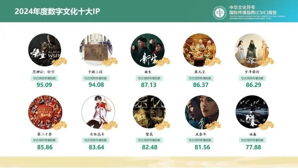 在综合考虑文化传播深度、文化创新性与适应性、文化影响力、受众反馈等文化引导力因素基础上,报告结合国际传播指数模型,形成“2024年度数字文化十大IP”,依次是《黑神话:悟空》《卡游三国》《新生》《落凡尘》《少年歌行》《第二十条》《全职高手》《繁花》《庆余年》《咏春》,涵盖电影、电视剧、游戏、潮玩、网文、动漫、舞剧等多种数字文化传播载体。