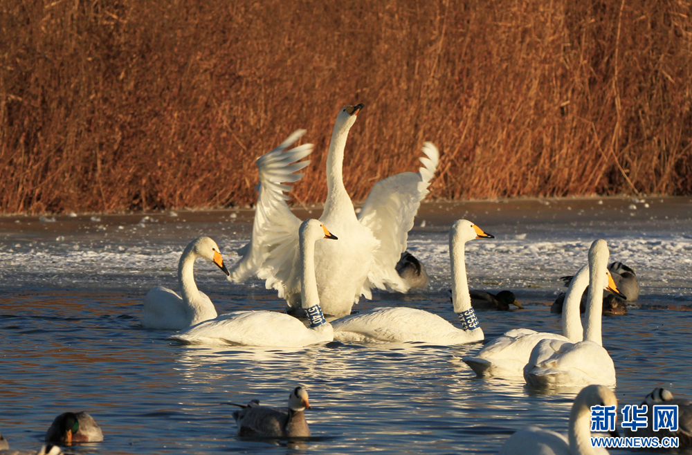 冬日里,在甘肃省张掖国家湿地公园,数只白天鹅沐浴着阳光悠闲地嬉戏、觅食,呈现出一幅自然和谐的生态画卷。新华网发(陈礼 摄)