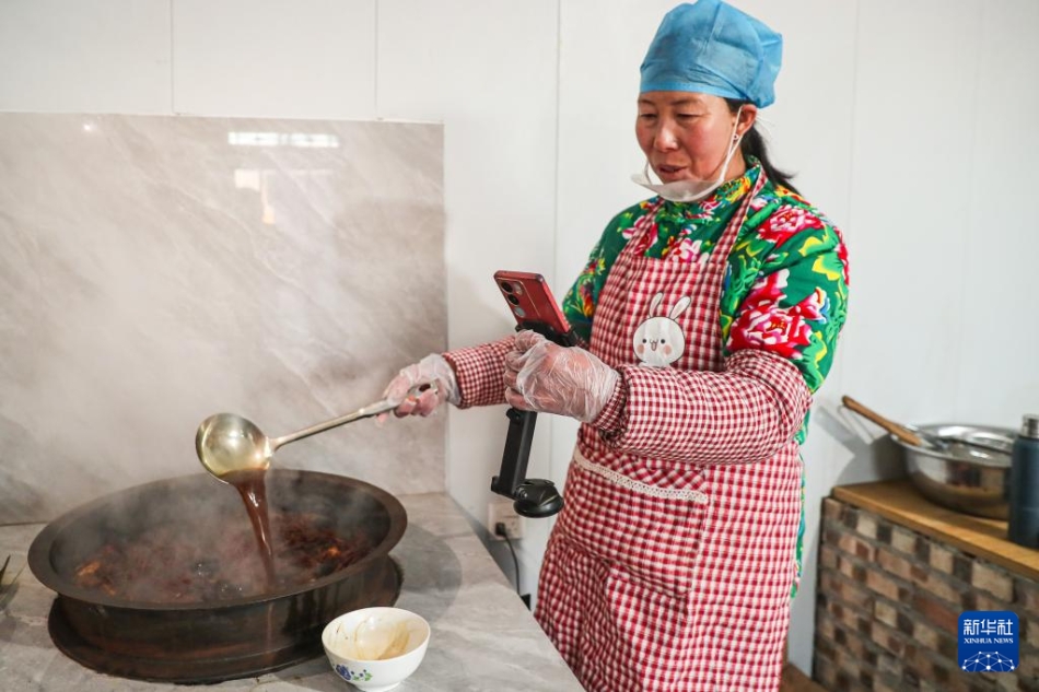 1月7日,在庆阳市环县洪德镇耿塬畔村,村民直播农家酱油制作场景。新华社记者 郎兵兵 摄