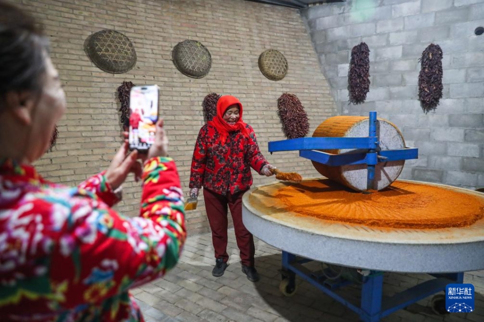 1月7日,在庆阳市环县洪德镇耿塬畔村,村民直播辣椒面制作场景。新华社记者 郎兵兵 摄