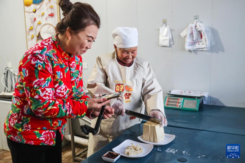 1月7日,在庆阳市环县洪德镇耿塬畔村,村民直播展示农家豆腐。新华社记者 郎兵兵 摄