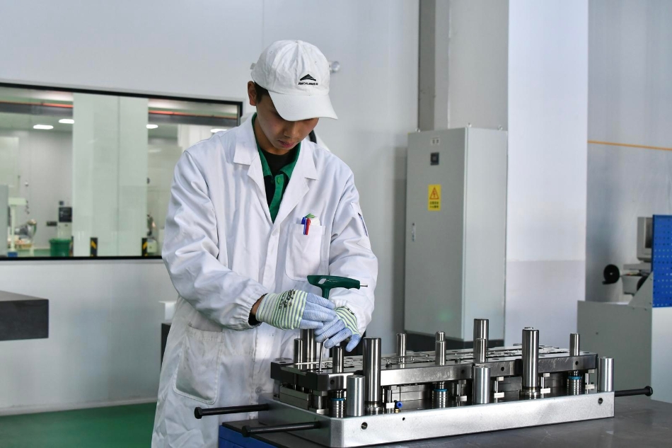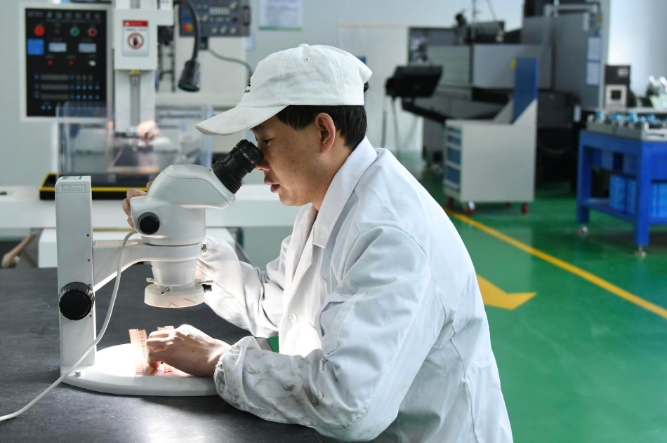 模具冲压法,是行业制作引线框架的主要生产工艺,其技术难点在于设计制作高精度的五金模件。企业车间操作工邓正龙告诉记者,公司产品的精度可达到正负0.015毫米,相当于头发丝的五分之一。“对于承载手机芯片的基础材料而言,既要做到小而轻,又要兼备各种功能,每一个细节都需要精心设计,反复‘打磨’。”邓正龙说。