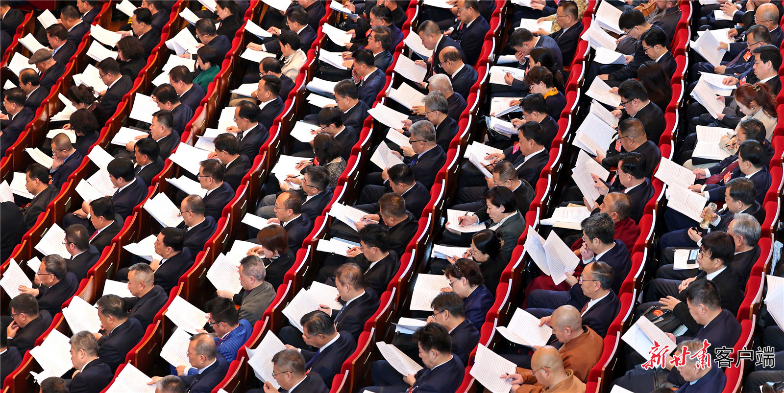 甘肃大剧院内灯光璀璨,气氛庄重热烈。中国人民政治协商会议会徽悬挂在主席台正中,十面鲜艳的红旗分列两侧。二楼眺台上,“紧密团结在以习近平同志为核心的党中央周围,加快建设幸福美好新甘肃、不断开创富民兴陇新局面,奋力谱写中国式现代化甘肃篇章!”的巨幅标语,鼓舞人心,催人奋进。