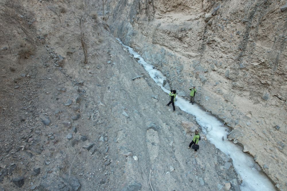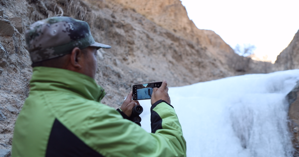 这是一条山洪开出的沟道,崎岖难行,两旁是陡峭的崖壁。石缝中的积雪和坚冰增加了攀爬的难度,我们小心地在大小石砾间寻找着合适的落脚点。然而对于李洪虎和他的同事们来说,这不过是一条寻常的巡护路。