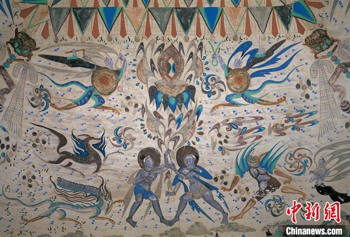 莫高窟第285窟窟顶东披的伏羲女娲图像。(敦煌研究院 供图)