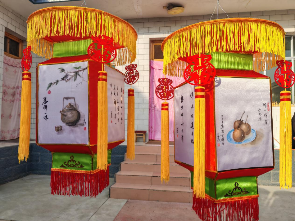 苏义鸿是“什川灯火”县级传承人,他在制作花灯时,对花灯的工艺、材料进行了改良,同时还结合花灯寓意,绘画十二生肖、山水等图案,增加花灯的灵动性。他介绍,花灯一般都采用蜡烛,以前扎骨架都用的是浆糊,比较容易松动,所以他今年制作花灯骨架选择了铁丝,工艺上使用电焊,让花灯牢固耐用。花灯的纸面也升级为丝绸面,彩穗也由原来的纸穗升级为丝绸彩穗,还将古诗句用书法写上去,非常精致。这样做的花灯,不容易划破,便于保存,且可长时间使用。