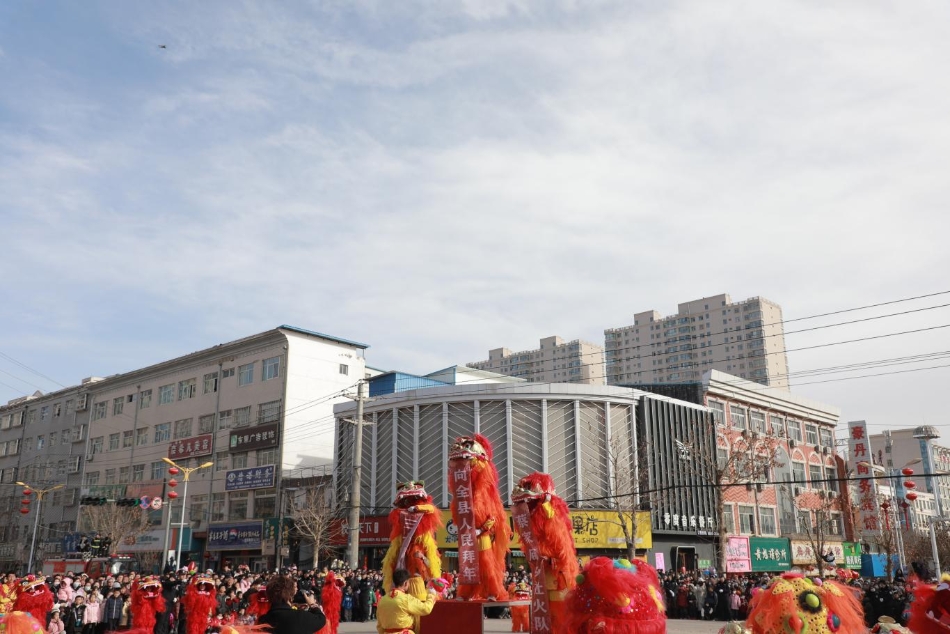 尽管天气寒冷,但社火表演队员们情绪高涨、精神抖擞,他们身着艳丽的节日盛装,踏着欢快的节奏,依次登场亮相。舞龙队翻腾跳跃,龙身蜿蜒起伏,仿佛真龙降临人间;舞狮队则憨态可掬,时而跳跃,时而嬉戏,引得现场观众阵阵掌声。