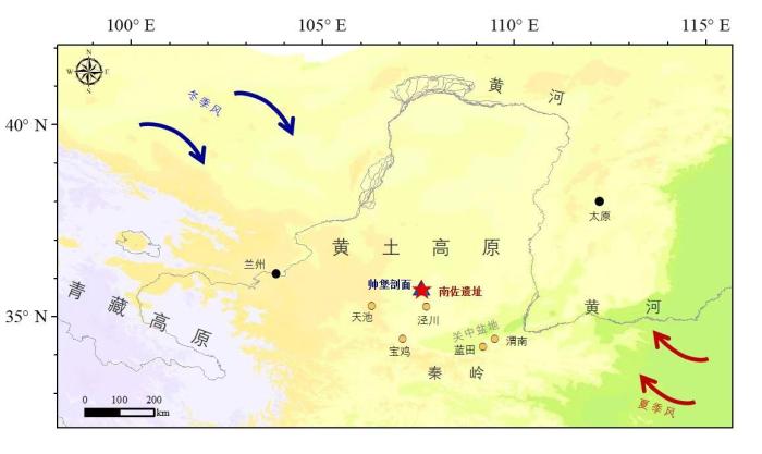 南佐遗址和帅堡剖面地理位置及所受季风影响示意图。韩建业 供图