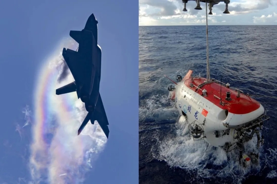 “威龙”歼-20隐身战斗机(左),蛟龙号载人潜水器(右)。图源:人民日报微信公号