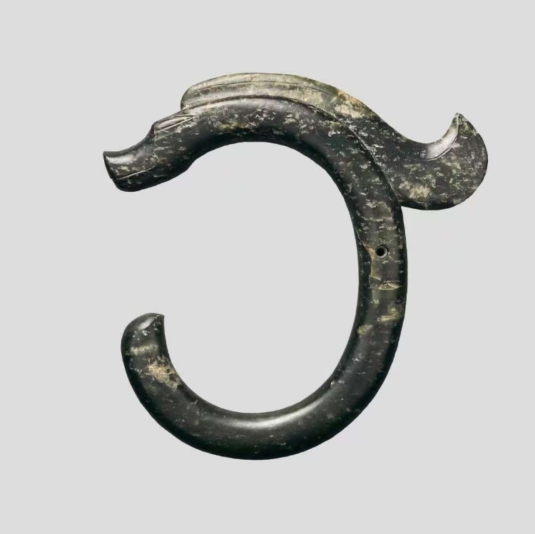 五千多年前的红山先民,用一块碧玉雕出“C形玉猪龙”——圆目低首,身体蜷曲如环。这种造型可能与早期人类对自然力量的原始崇拜相关,龙作为沟通天地的媒介,尚未具备昂扬姿态。