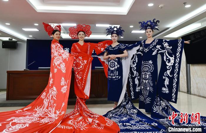 5月8日,第二十届庆阳香包民俗文化节新闻发布会在兰州举行。图为发布会现场,模特展示剪纸元素服饰“剪云裳”。庆阳市融媒体中心供图