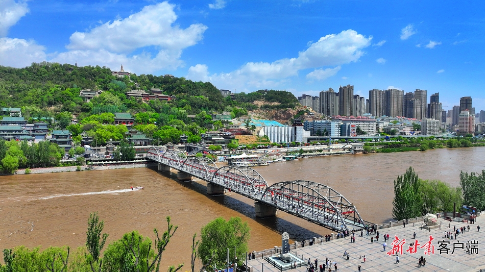 黄河穿城而过,在蓝天的映照下,河水波光粼粼,河畔的绿植愈发葱郁,处处洋溢着生机与活力。