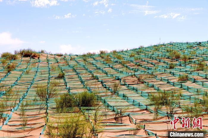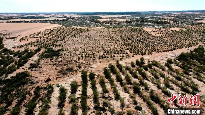 图为甘肃武威市民勤县“雨养+节水”治沙造林示范区,先进技术与自然规律协同发力,让荒漠变绿洲。(资料图)马爱彬 摄