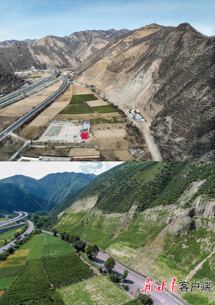 夏河县曲奥乡曲奥林场后山历史遗留采石点生态修复前后对比。