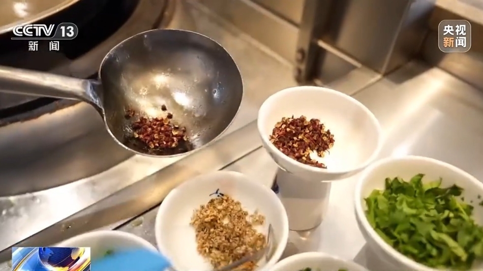 浆水最地道的做法,就是炝。花椒、野葱花、生韭菜、红椒丝等食材先后下锅。