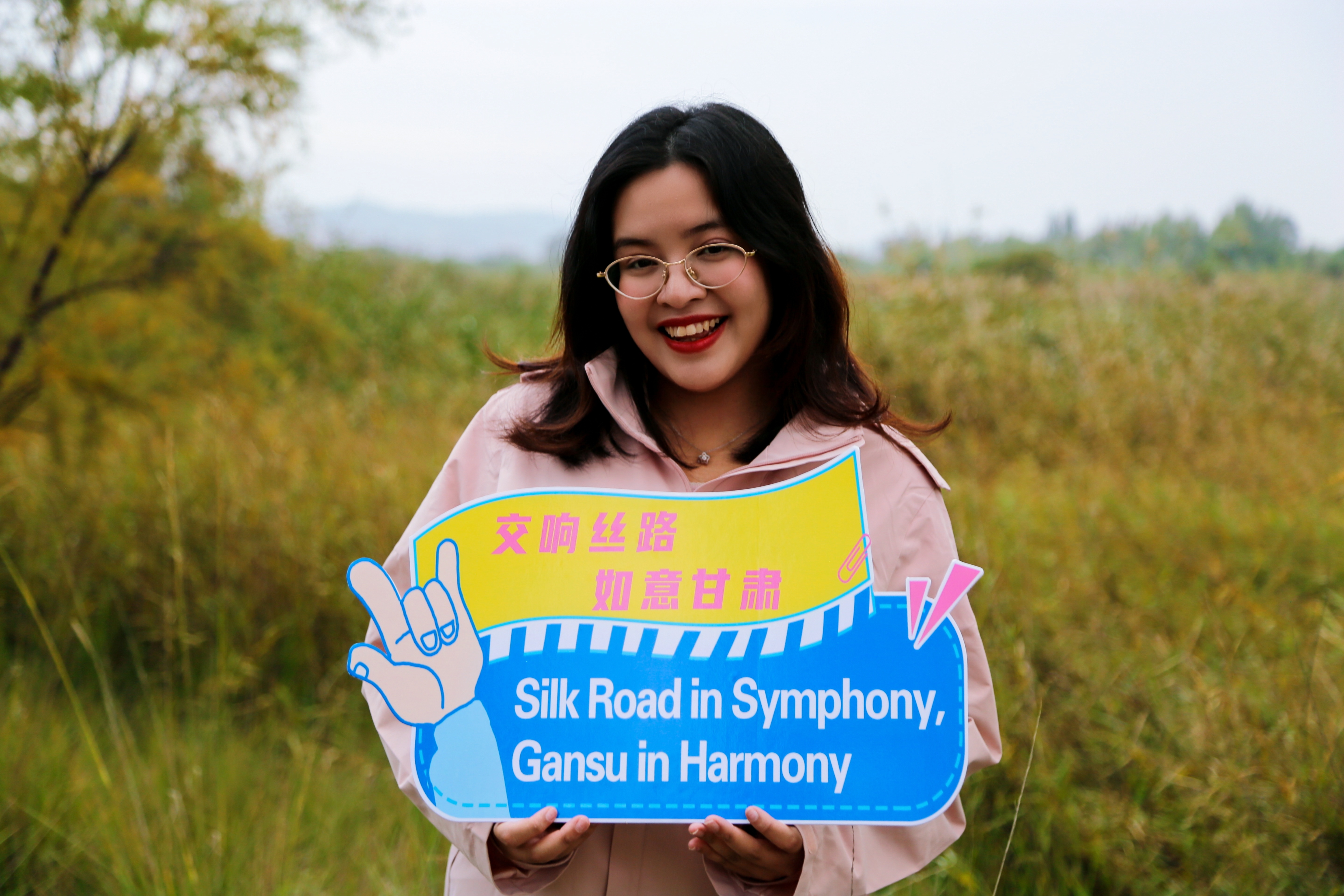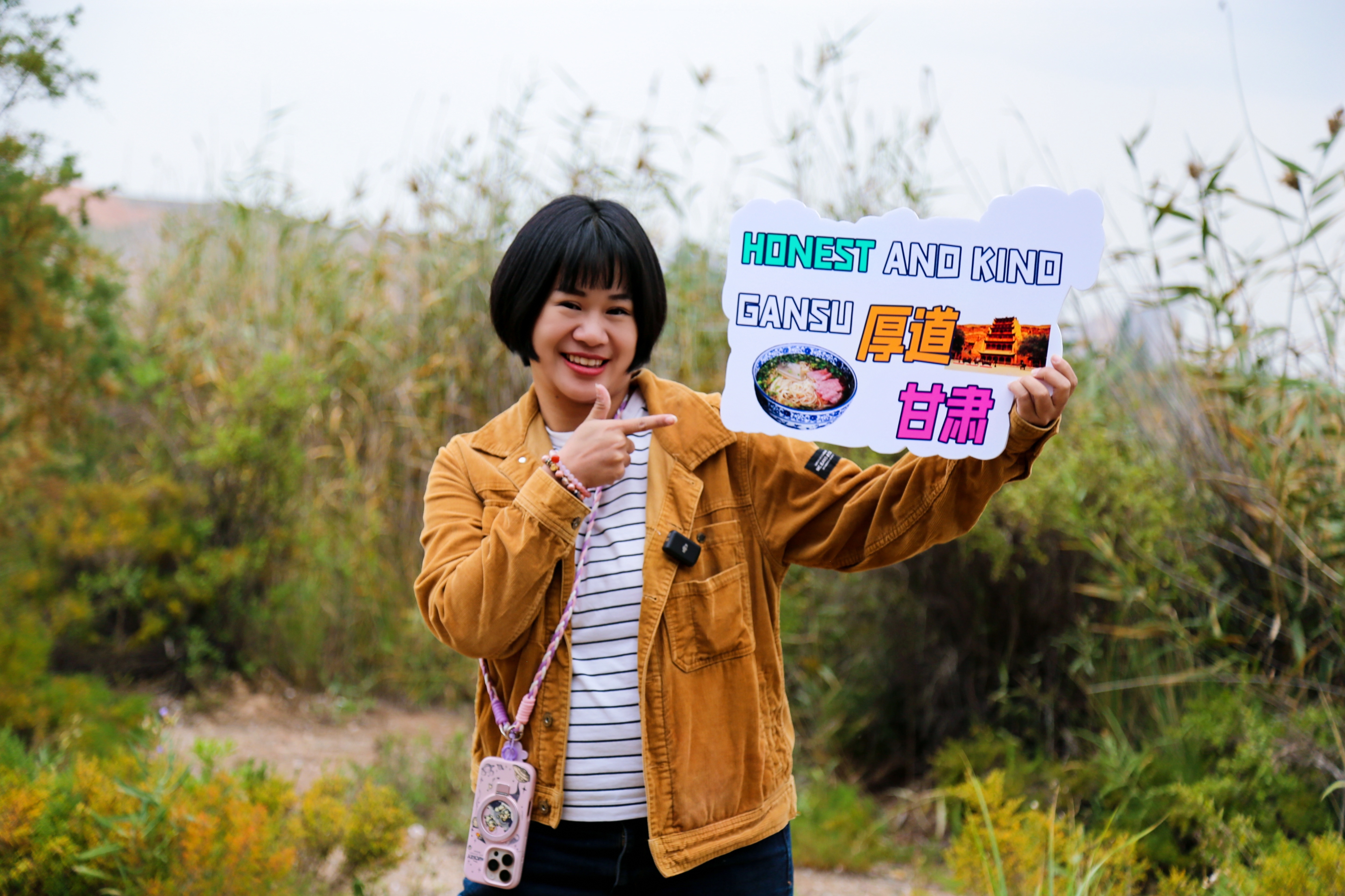 来自印度尼西亚的外国网红博主(秦露妍)在秦王川国家湿地公园拍照留念
