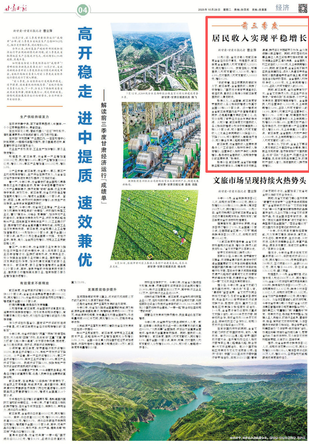 张涛认为,从全国看,前三季度甘肃居民收入名义和实际增速分别高于全国1.0和1.1个百分点。这一增速与全省前三季度国内生产总值增速基本同步,这是高质量发展的应有之义,也充分体现了甘肃经济社会发展的稳与进。从城乡看,前三季度农村居民收入名义和实际增速分别快于城镇居民1.3和1.5个百分点,城乡居民人均可支配收入之比由上年同期的3.31降至3.27,下降了0.04,城乡居民收入差距继续缩小,城乡融合发展之路越走越宽广。