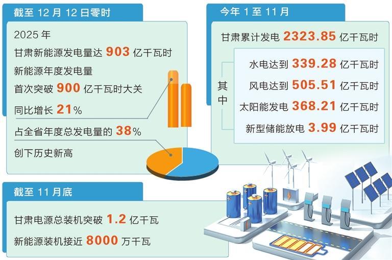 每日甘肃网讯(新甘肃·甘肃日报记者 王占东)记者从国网甘肃省电力公司获悉,截至12月12日零时,2025年甘肃新能源发电量达903亿千瓦时,新能源年度发电量首次突破900亿千瓦时大关,同比增长21%,占全省年度总发电量的38%,创下历史新高。这相当于节约标准煤约2700万吨,减少二氧化碳排放约7200万吨,有力助力能源低碳转型。