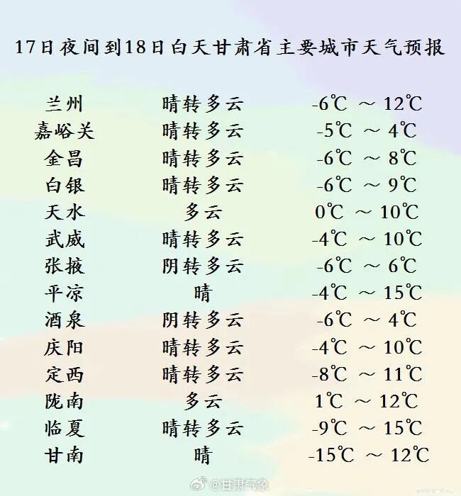 今天夜间到明天白天(12月17日20时-12月18日20时),酒泉、嘉峪关两市晴转多云;省内其余地方晴或多云。另外河西五市有4-5级西北风。