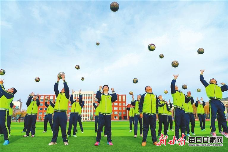 嘉峪关市实验中学学生在绿茵场做“足球操”。