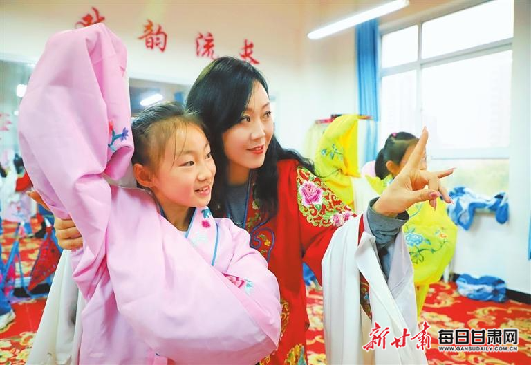 静宁县实验小学戏曲社团教师指导学生表演戏曲。
