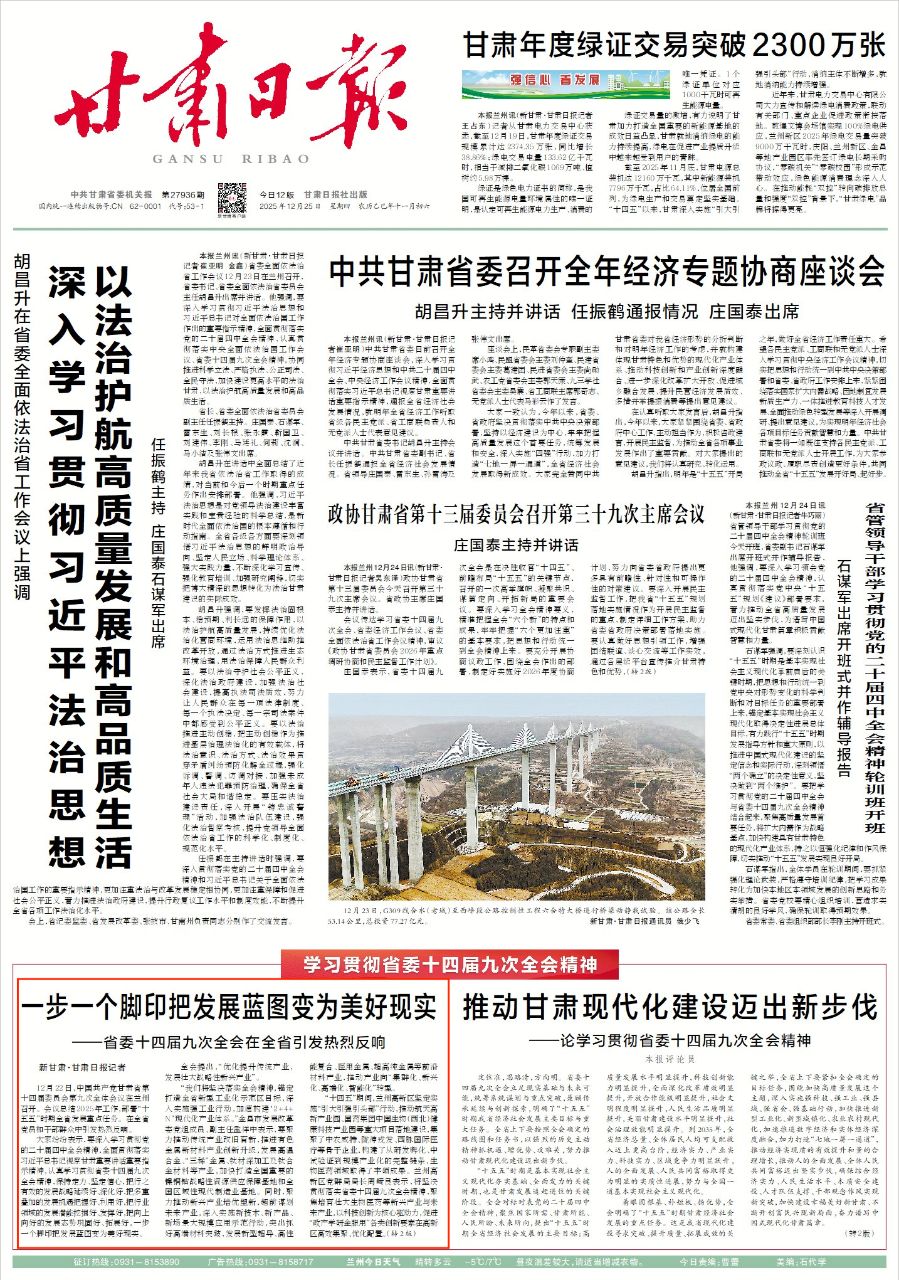 12月22日,中国共产党甘肃省第十四届委员会第九次全体会议在兰州召开。会议总结2025年工作,部署“十五五”时期全省发展重点任务。在全省党员和干部群众中引发热烈反响。