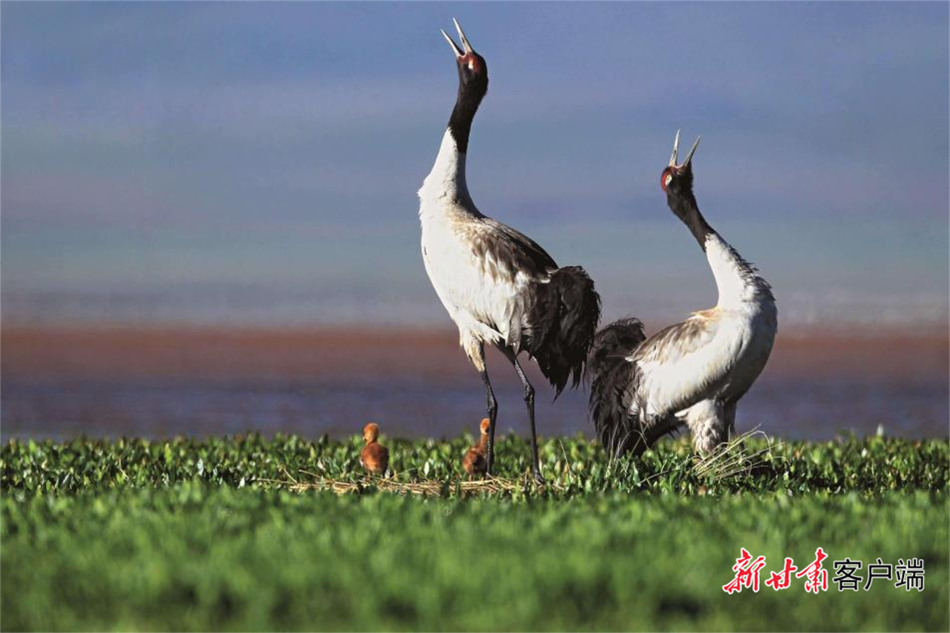 尕海湖边嬉戏的黑颈鹤。