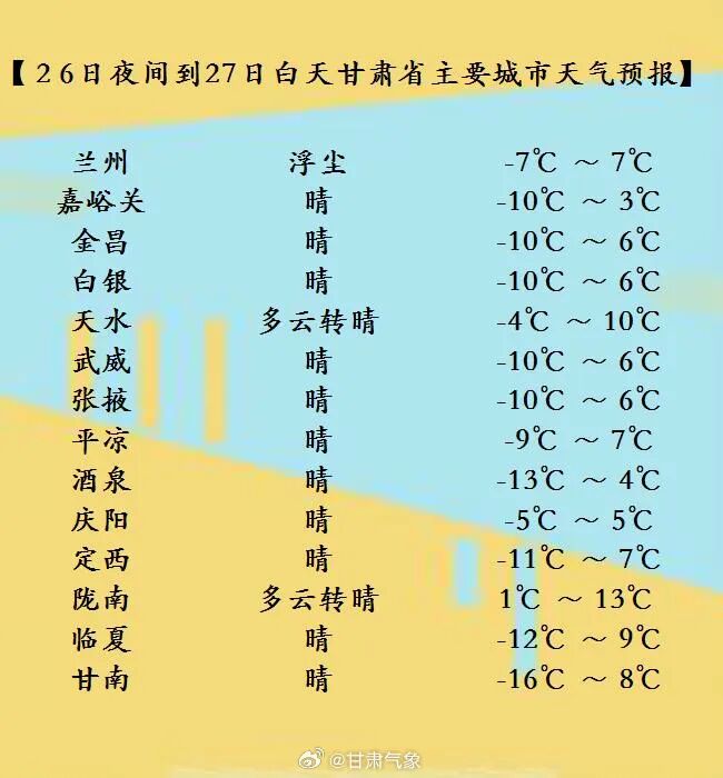 1月26日20时至1月27日20时,全省各地晴或多云,甘南高原有4至5级偏西风。另外,白银、兰州两市部分地方及定西、天水、平凉、酒泉等市局部地方有浮尘。