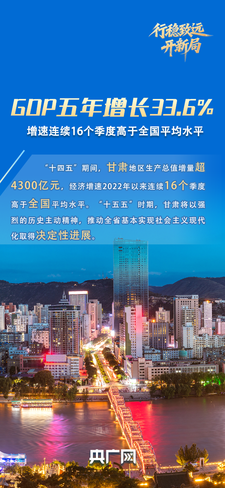 前景有望,心里有底。从乡村到全域,从文旅到全产业链,“十四五”期间,不甘落后的甘肃交出了一份山河共秀、民生共富的亮眼答卷:地区生产总值达到13697.5亿元,较“十三五”末的9323.1亿元增加4374.4亿元,增长33.6%,经济增速2022年以来连续16个季度高于全国平均水平……幸福美好新甘肃建设取得重大成就,中国式现代化甘肃实践迈出坚实步伐。