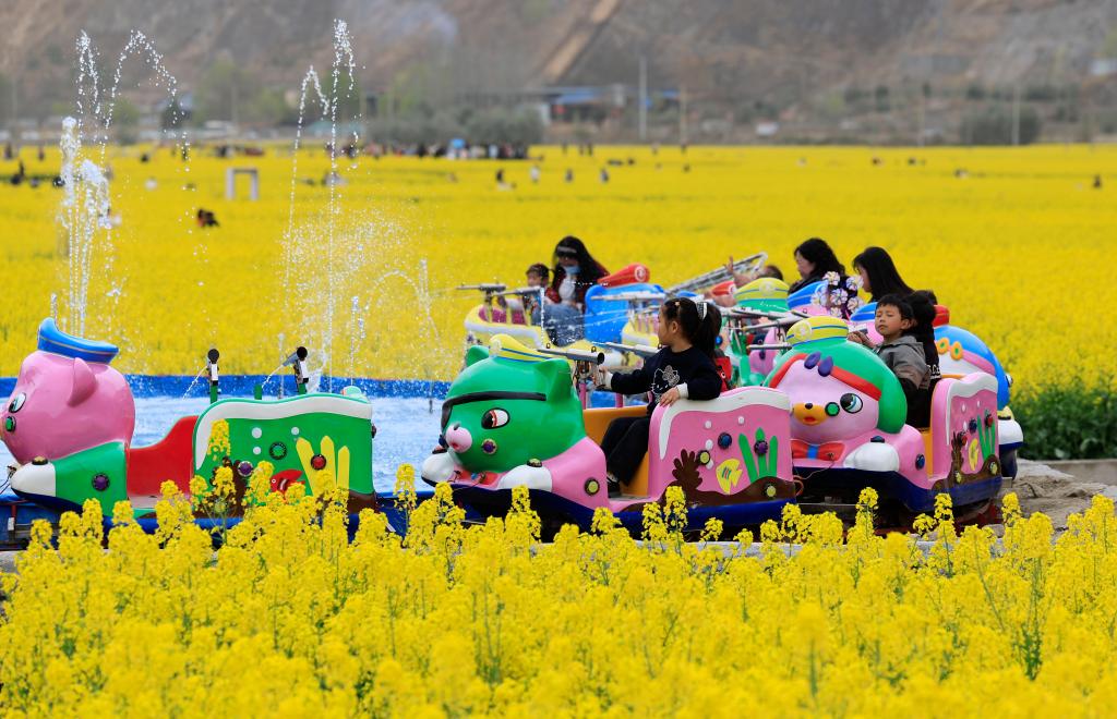 甘肃省陇南市武都区角弓镇硝坝子村油菜花基地里,游客在小型游乐园玩耍。新华社记者 李杰 摄