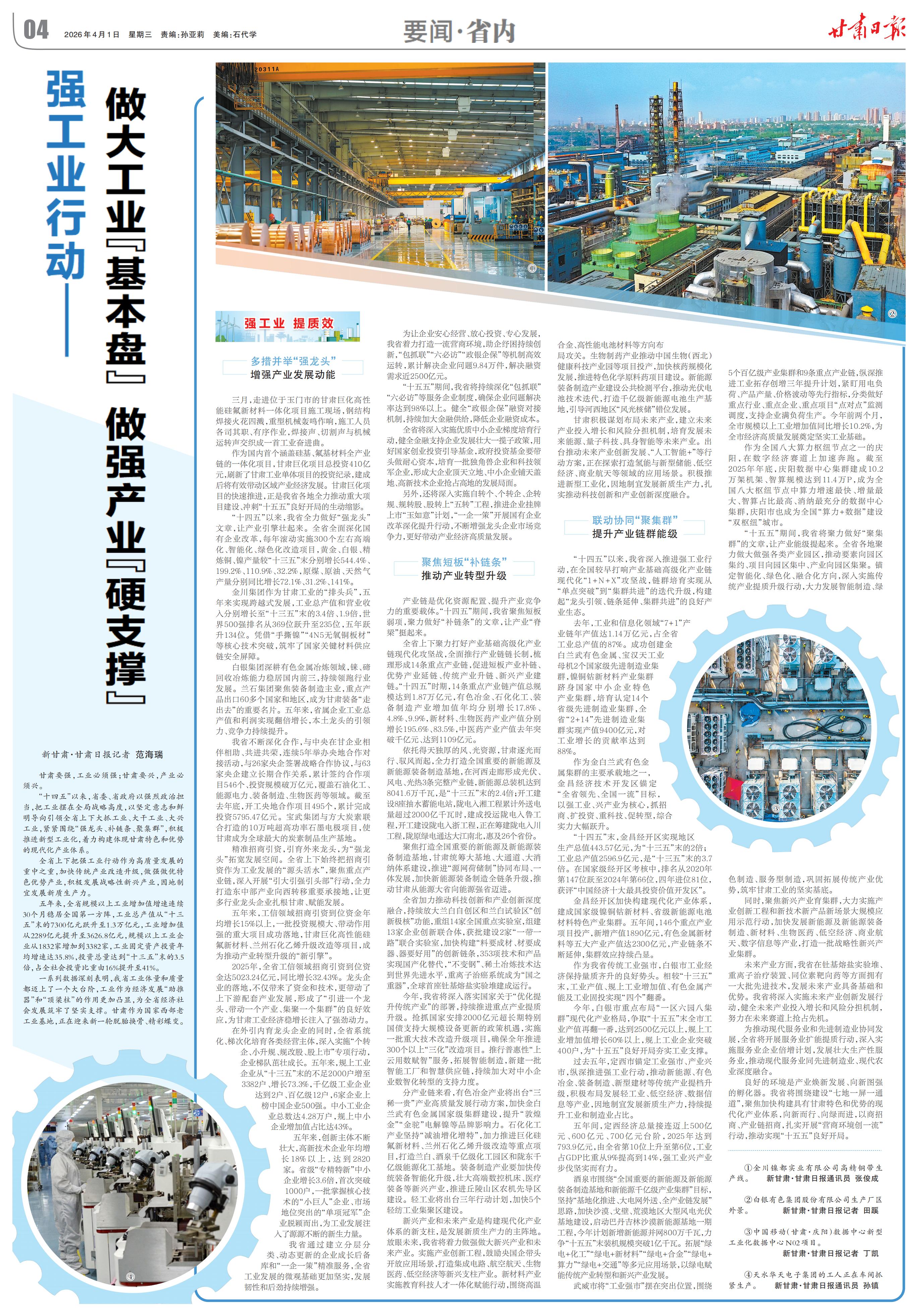 “十四五”以来,省委、省政府以强烈政治担当,把工业摆在全局战略高度,以坚定意志和鲜明导向引领全省上下大抓工业、大干工业、大兴工业,紧紧围绕“强龙头、补链条、聚集群”,积极推进新型工业化,着力构建体现甘肃特色和优势的现代化产业体系。