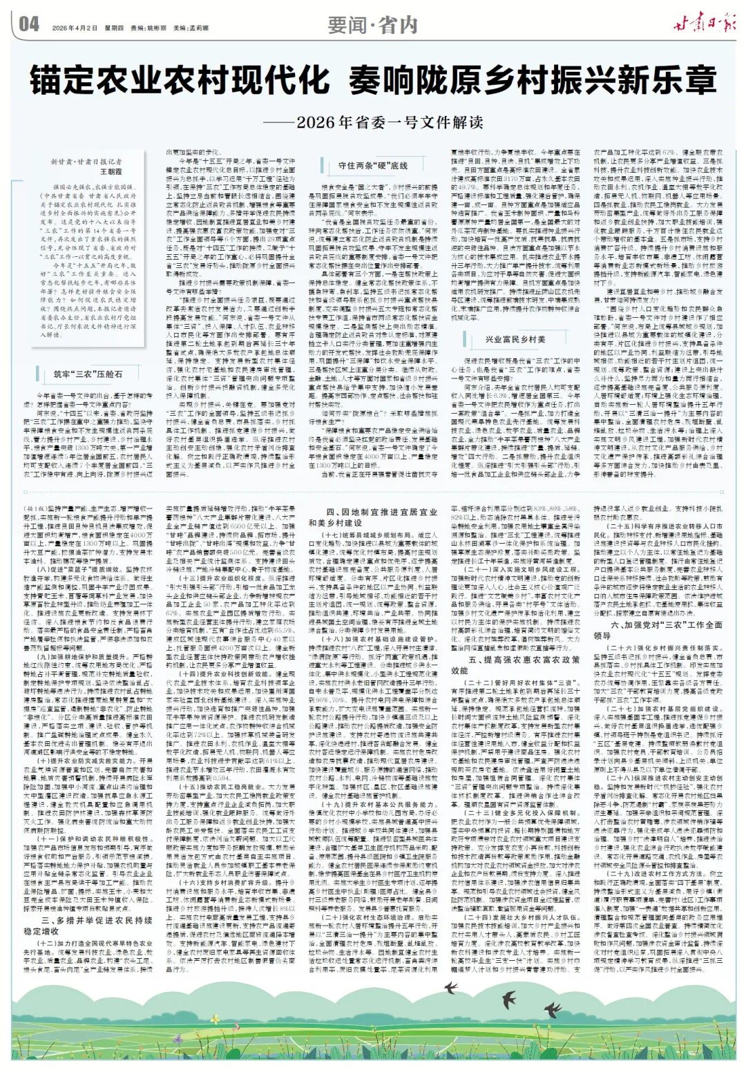 今年是“十五五”开局之年,省委一号文件锚定农业农村现代化总目标,以推进乡村全面振兴为总抓手,以学习运用“千万工程”经验为引领,在保持“三农”工作布局总体稳定的基础上,坚持立足当前和着眼长远相结合,围绕建立常态化防止返贫致贫机制、增强粮食等重要农产品供给保障能力、多措并举促进农民持续稳定增收、因地制宜推进宜居宜业和美乡村建设、提高强农惠农富农政策效能、加强党对“三农”工作全面领导等6个方面,提出29项重点任务,既是对“十四五”工作的接续,又赋予“十五五”开局之年的工作重心,必将巩固提升全省“三农”发展好势头,推动陇原乡村全面振兴取得新成效。