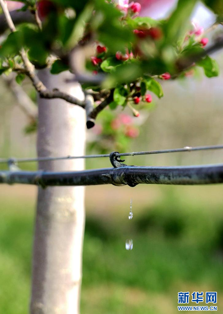 4月26日,在甘肃省平凉市静宁县城川镇有机苹果示范园,滴灌系统对果树精准施肥。新华社发(王毅 摄)