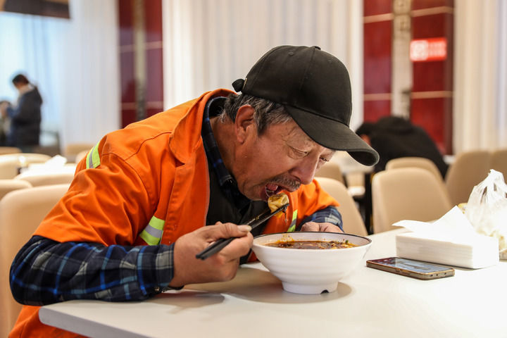 “以前干完活就在外面买吃的,每天吃饭要花30元左右,现在按时按点过来吃,每天花10元,吃得也好。”64岁的环卫工人李仕宏常年一个人生活,他最喜欢吃这里的饺子和干拌面,“量大、味道好,厨师们看我岁数大,还会煮得软烂一些”。